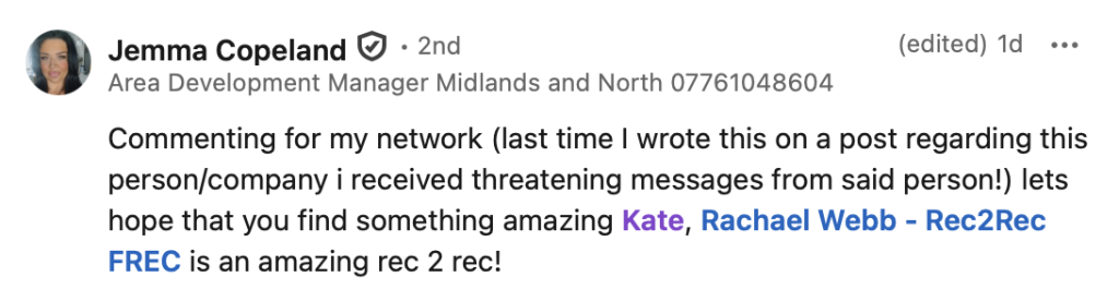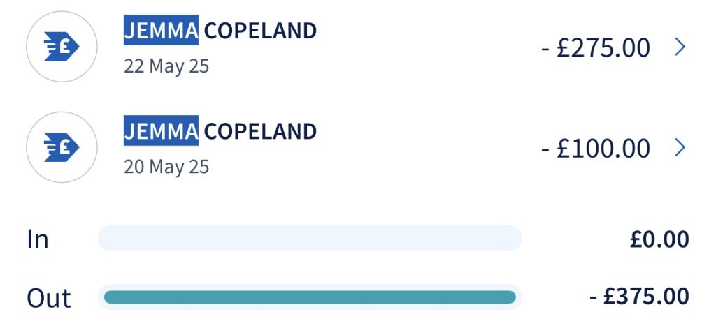 Also making claims of non payment – Jemma was taken on a retainer invoice for 5 weeks and in that time she was loaned money from me because she was short having not had a job. A rate was agree for a 4 week period in which time Jemma received 3 payments in total. in the 5 weeks she had claimed to be doing work for the company she had gone to Benidorm for 1 of them, failed to deliver any kind of work other than a data spreadsheet of contacts from her former employment we couldn’t use for data protection reasons. Jemma was given money upfront because of her situation
