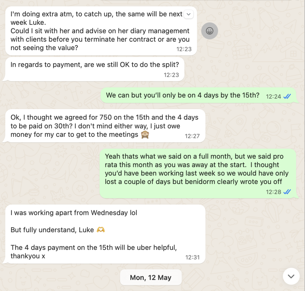 This week we have been working tirelessly putting out fires and delivering work whilst trying to run and host events with the prospect of still paying Kate here 8 days worked for August (still no emails sent, no meetings had, no calls made no work done or evidenced) to bottom out the employee so both parties can move on even taking into account the above. However todays post paints myself and the company in a bad light with missed information.