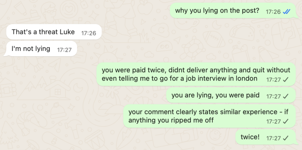 Kate has received a total amount from Coolmedia of £1911.76 which was the amount owed for her service in July. Kates position was terminated early August through threats of violence made towards myself and family members. Falsely claiming she hasn’t been paid at all is an outright lie and her actions since August 24th have put the company into difficulty. Kate openly stated that in August she hadn’t worked because of stress the delayed payment had and no evidence of work was shown for the entirety of August, no emails sent, no calls made, no meetings sat for Coolmedia, no client spreadsheet updates. As recompense for the threats made to me and my partner and to draw a line under the whole thing we still said payment would be made prior the post.
